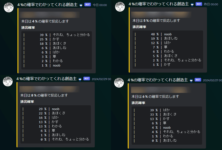 ランダム排出の確率を決める時に、 「39%, 25%, 18%, 6%, 6%, 3%, 2%, 1% ...」 みたいな程よいばらつきがある確率分布を安定して生成する方法。(創造主botでメッセージの抽選に使用したもの)