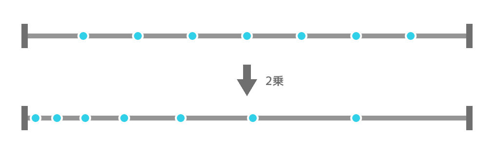 数直線上に等間隔に点を打ったとして、それを2乗すると右へ行くほど点同士の間隔が大きくなる。