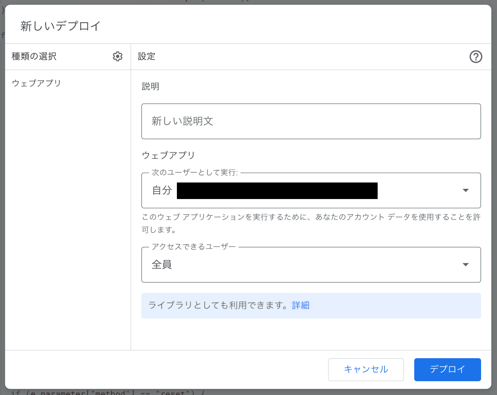 右上の「デプロイ」→「新しいデプロイ」から、「ウェブアプリ」を選ぶ。アクセスできるユーザーを「全員」にして、デプロイでOK。