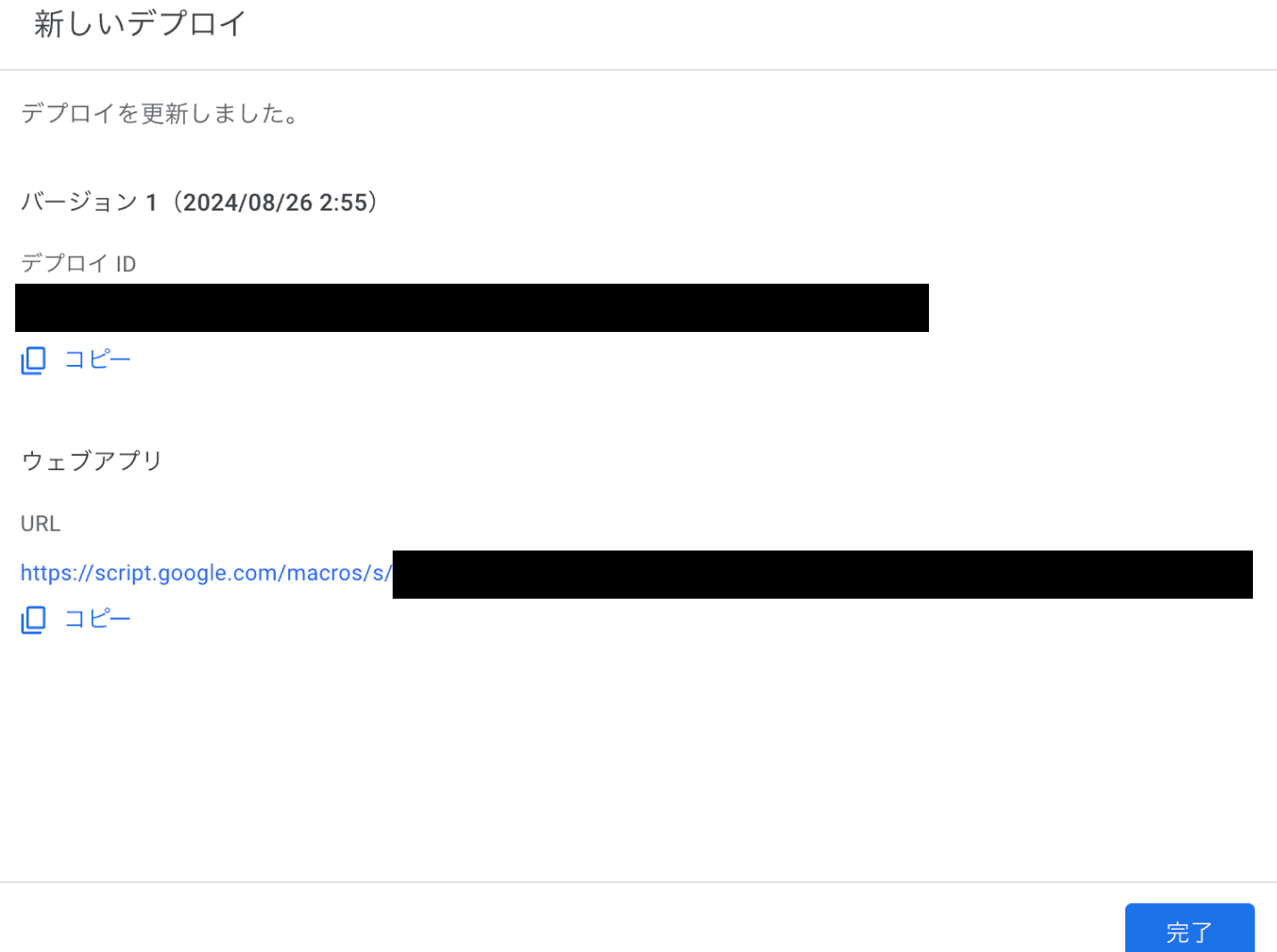 「ウェブアプリ」の欄に出てくるURLから、作ったアプリのAPIを叩くことができる。