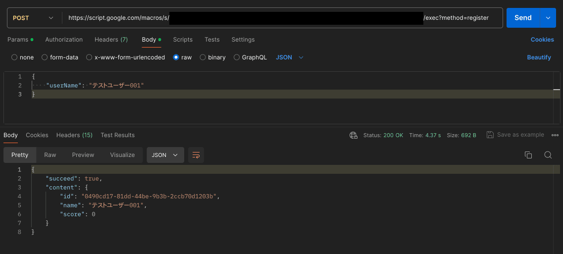次に、実装したメインロジックをPOSTから叩く。成功パターンでは、その結果がJSONで帰ってくる。