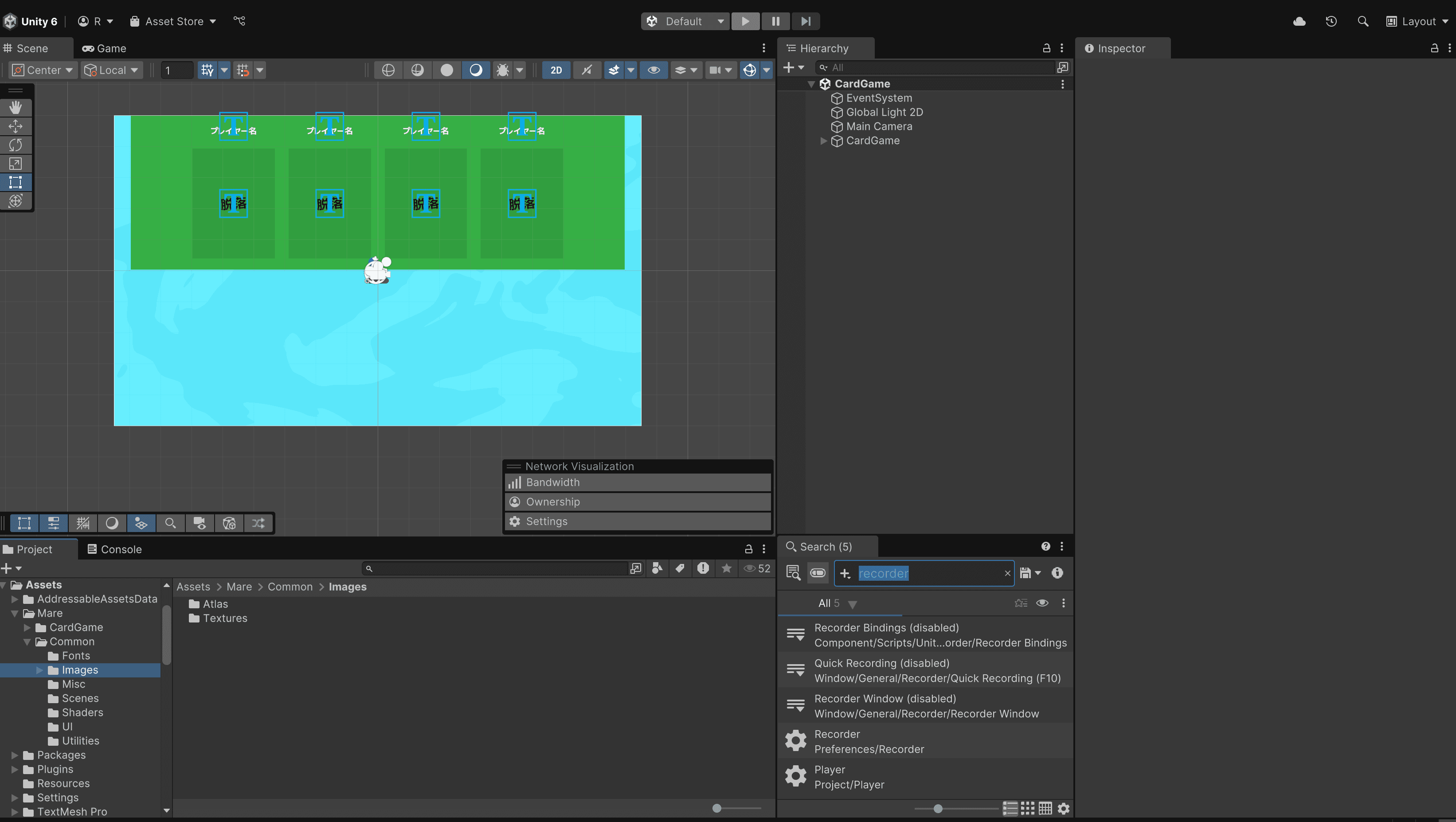 下に自分の手札があって、上側にみんながカードを出すフィールドがある 、っていう感じ。一旦カードっていう感じの見た目にしたんだけど、手元にあるときと場に出てる時で優先したい情報が違うから、そこちゃんと別のUIにしないとな〜。