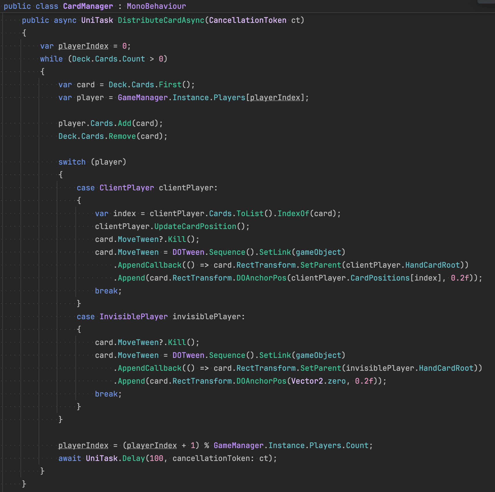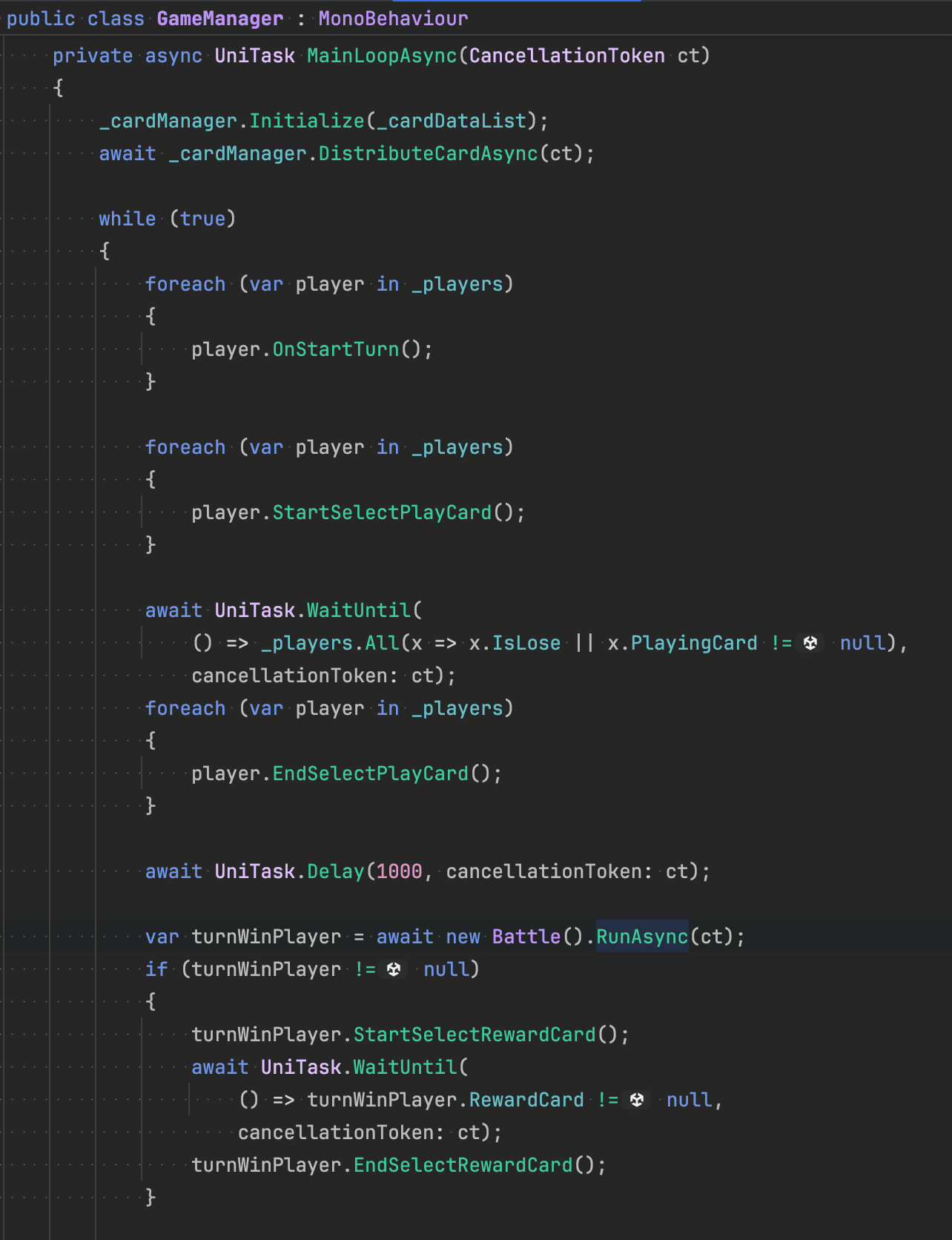 これは ゲーム全体の流れ をもつ部分。カードを配って、ターンを初期化して、プレイヤー全員がカードを出すまで待って、出されたら勝利判定。勝ったプレイヤーに取るカードを選ばせる。ほぼ英語のようにそのまま読めるんじゃないかな。