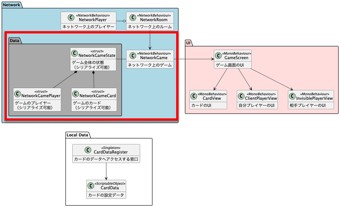 カードゲームだと先にやっておきたいことがあって、それが通信や表示なしでゲームを実行すること。これができると、プレイヤーの操作が可能かをクライアントだけでチェックできたり、ゲームバランス調整用のシミュレータが作れたりする。