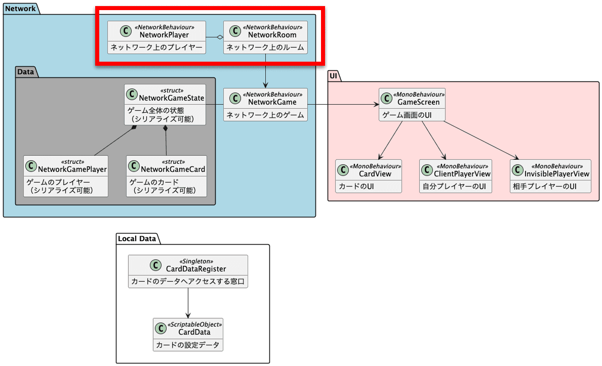 NetworkGame(図の真ん中くらいにある)がメイン実行部分となって、全体の制御を持つ。ゲームロジックはサーバーでだけ実行し、何らかの表示更新や演出が必要なタイミングで、クライアントに向けてRPCを行う。