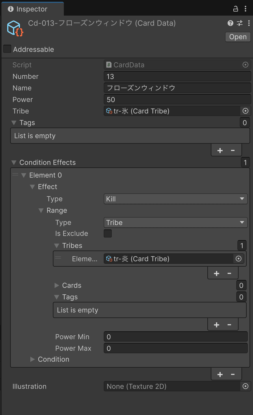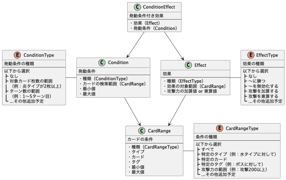 問題なのは、選択したTypeによっては必要ないプロパティまで設定項目に存在してるってこと。あと効果文もゲームを再生してみないと表示されない。(この図作ってて思ったけど、ConditionはBattleConditionに改名した方がいいし、CardRangeはCardConditionに改名した方がいいな)